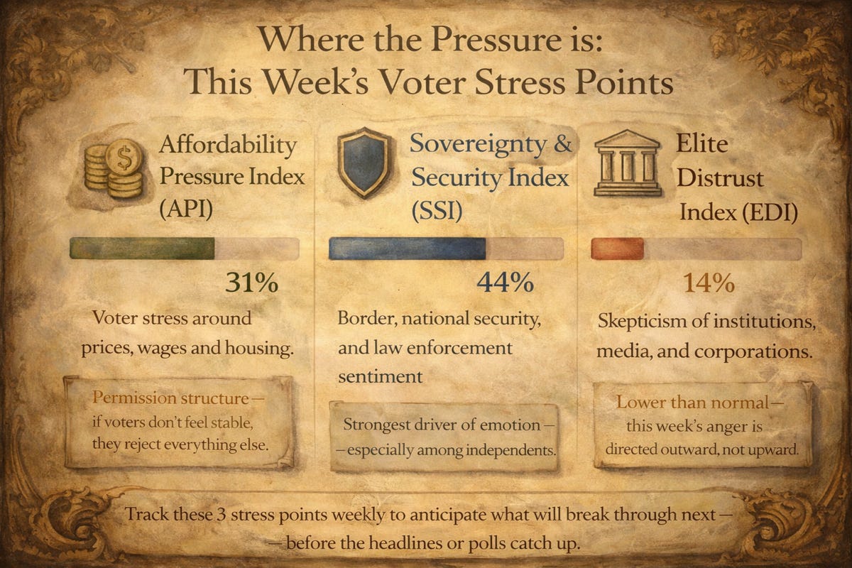 This week, we launched a new feature inside the EyesOver Weekly Snapshot: three real-time indexes that measure exactly where voter stress is building — before headlines or polls catch up.